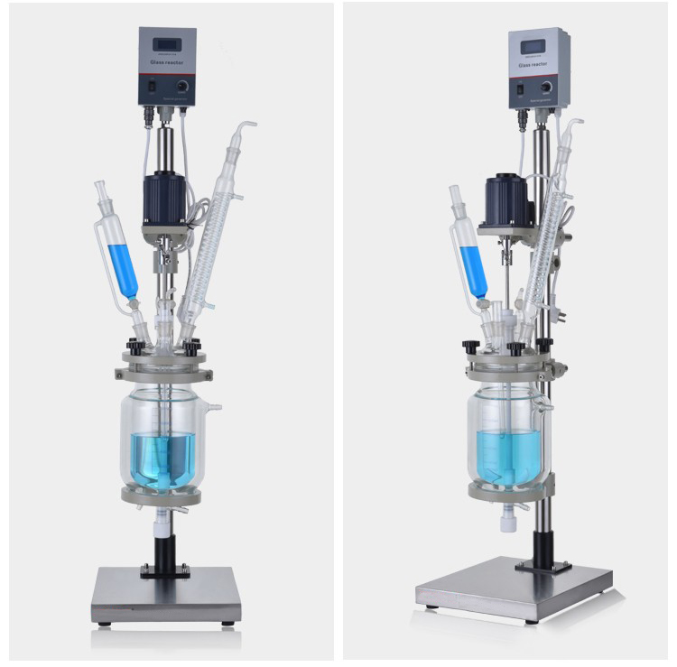 本機(jī)具有電動(dòng)恒速攪拌系統(tǒng)、冷凝、滴加系統(tǒng),釜體夾層需外接加熱或制冷的循環(huán)設(shè)備。在攪拌物料的同時(shí),通過(guò)夾層注入循環(huán)的熱溶液或冷卻液,對(duì)釜內(nèi)的物料進(jìn)行恒溫的加熱或制冷。物料進(jìn)行加熱反應(yīng)時(shí),在真空條件下可以提高蒸發(fā)效率(需連接真空裝置),溶媒蒸汽經(jīng)玻璃冷凝盤管時(shí)冷卻成液體(需連接冷卻裝置),可回流到釜內(nèi),也可通過(guò)回流彎頭下部閥門進(jìn)行回收。反應(yīng)完畢,物料可從釜底的側(cè)出料口放出。