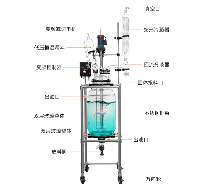 雙層玻璃反應(yīng)釜內(nèi)層放置反應(yīng)溶媒可做攪拌反應(yīng),夾層可導(dǎo)入冷凍液、水和高溫液體。在密封玻璃容器內(nèi),反應(yīng)物在常壓或負(fù)壓條件下攪拌反應(yīng),對(duì)物料進(jìn)行升溫和冷卻。全透明的反應(yīng)過(guò)程一目了然。同時(shí)可抽真空和調(diào)速攪拌。用于化學(xué)、精細(xì)化工、生物制藥新材料合成等試驗(yàn)、中試及生產(chǎn)。產(chǎn)品可與低溫冷缺液循環(huán)泵、高低溫循環(huán)一體機(jī)、高溫恒溫循環(huán)油浴鍋、循環(huán)水式真空泵等組成系統(tǒng)裝置。