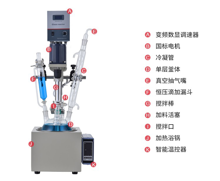 單層玻璃反應釜配套高溫油水浴鍋,提供單層玻璃反應釜需求熱熔媒;或者額外配置浴鍋冷凝盤管,提供單層玻璃反應釜需求冷熔媒;從而對反應釜內(nèi)的物料進行恒溫加熱或制冷。物料在反應釜內(nèi)進行反應,并能控制反應溶液的蒸發(fā)與回流等一系列實驗過程,反應完畢,規(guī)格為10L以上單層玻璃反應釜物料可從釜底的全密封放料口放出,操作極為方便。