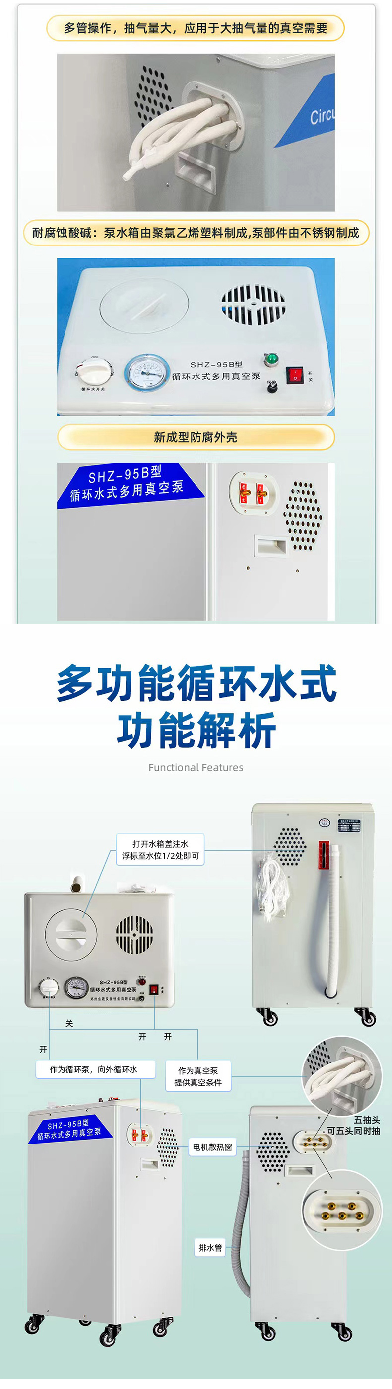 SHZ-95B型成型防腐外殼五抽頭循環(huán)水多用真空泵是大功率多頭抽氣的一種新成型防腐外殼循環(huán)水式多用真空泵,本機(jī)設(shè)計(jì)內(nèi)外循環(huán)水,可以三頭同時(shí)抽氣,具有不用油、無(wú)污染、功率大、噪音低、方便靈活,節(jié)水省電等優(yōu)點(diǎn),一機(jī)多用。